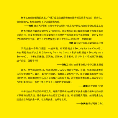 本书总结了作者多年的实战经验,从5个维度全面介绍了云安全,并提供了诸多测试用例。覆盖了实践中的许多痛点,讲解十分透彻。