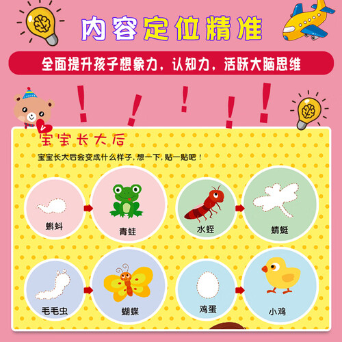 采用图文并茂的方式,让孩子参与到有趣的游戏当中,精巧 妙的贴纸设计,让孩子自己动手找到游戏的答案,锻炼孩子的观察能力。