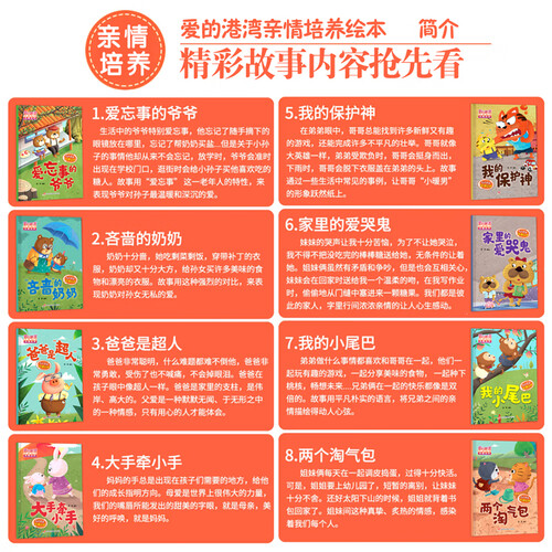 此书一共8册,皆围绕“亲情”主题讲述,生动可爱的卡通形象,易于将孩子代入阅读的环境中。书后设有成长启示录,便于教育孩子。