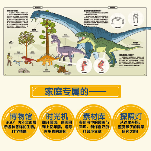 这套书以笔记形式展开故事内容,搭配整幅跨页彩图,生动直观地展现动物和植物的进化史,为小朋友们精彩呈现古今生物。