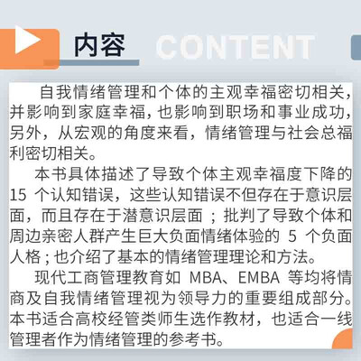 这本书描述了导致个体主观幸福度下降的15个认知错误,提出了基本的情绪管理理论和方法,旨在帮助读者更好的管理自己的情绪。