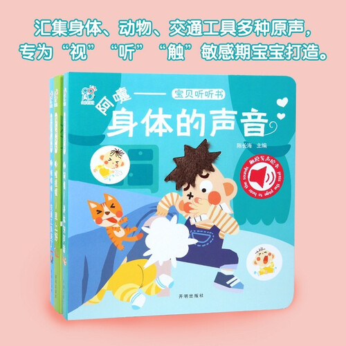这套书采集真实场景中动物、交通工具、大自然等声音,音质立体清晰,并且所有声音都在婴幼儿适宜接受的振动频率范围内。