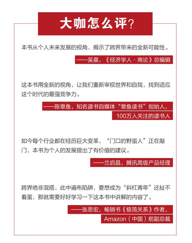 这本书从个人未来发展的视角,并结合大量历史资料,揭示了跨界带来的全新可能性,帮读者寻找适合自己的领域,展翅高飞。