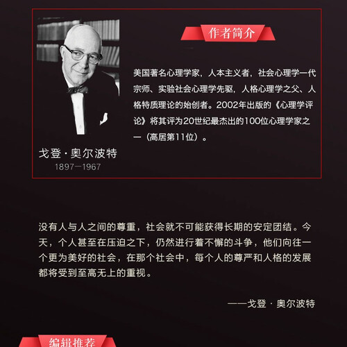 作者被称为人格心理学之父,文中所体现出的具有说服力的思想、民权公正的价值观为社会科学树立了一个标杆,给予人们明智指导。