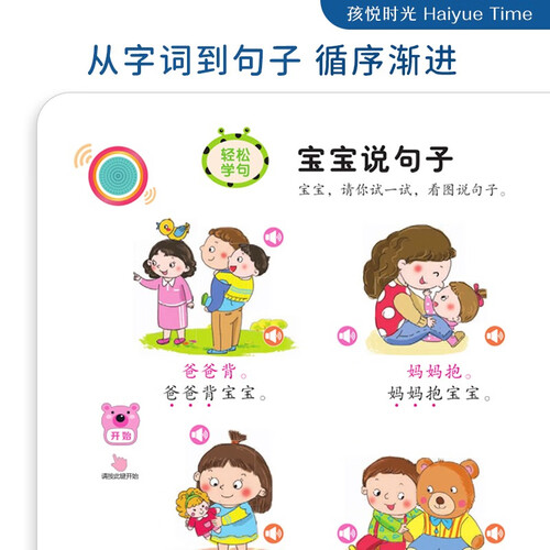 有趣的卡通彩图,非常吸引宝宝,通过触摸发声功能,能够马上吸引宝宝的注意。采用高质量的喇叭,声音清晰易懂。