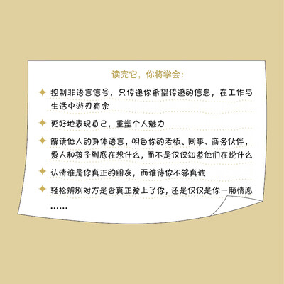 本书从心理学角度教你学会控制自己的非语言信号,更好的表现自己,同时教你学会解读他人的身体语言,洞察他人的内心想法。