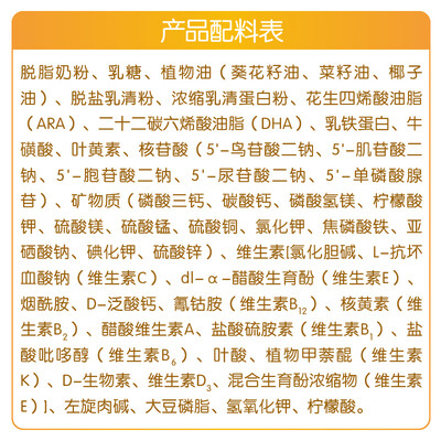 补充蛋白质、矿物质等多种营养成分,全力支持宝宝成长。添加叶黄素,有助于视网膜正常发育,让宝宝拥有好视力。