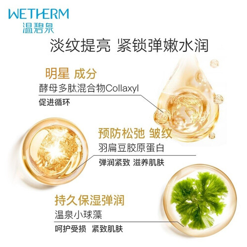泉芯P.H.C成分,修护肌肤保湿屏障,提升自身锁水力。水解大豆蛋白,提升肌肤弹力更显紧致,隐藏岁月痕迹。