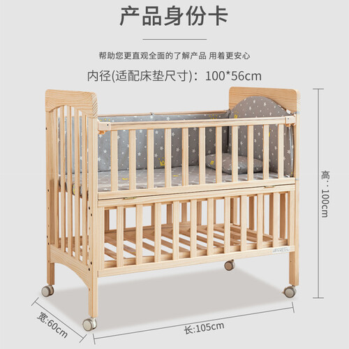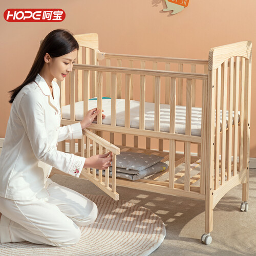 甄选进口的松木,纹路优美,不易开裂,可安心使用。放下侧护栏,可以成人床拼接,方便时刻照顾宝宝。
