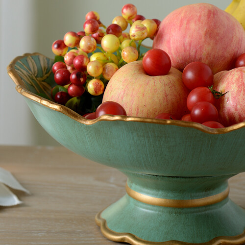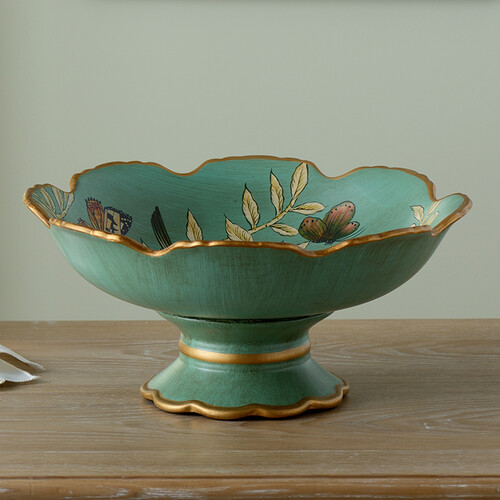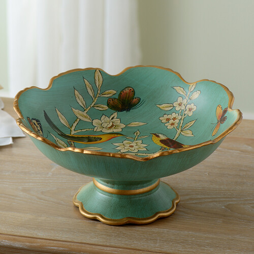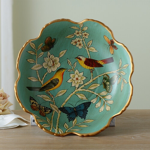 美式田园陶瓷水果盘摆件,花鸟相嘻蝴蝶的画面,气质华丽。浪漫的工笔彩绘,精湛的温柔笔触,精致灵动。