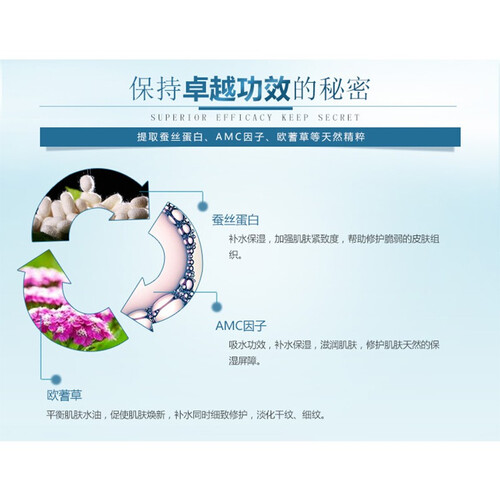 富含蚕丝蛋白成分,其能帮助修护脆弱的皮肤,有效平衡肌肤水油,促使肌肤换新,补水的同时淡化干纹。