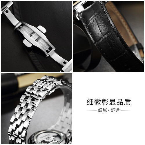 整个机身使用的精钢打造,表壳不生锈更不掉色。表带是优质的小牛皮材质,纹理细腻彰显质感,并且还可以实现50米的深度防水。