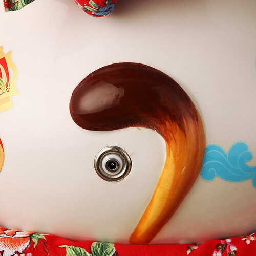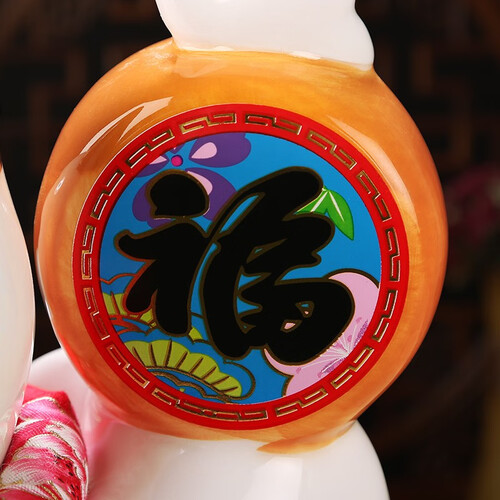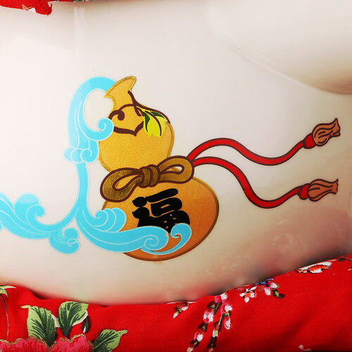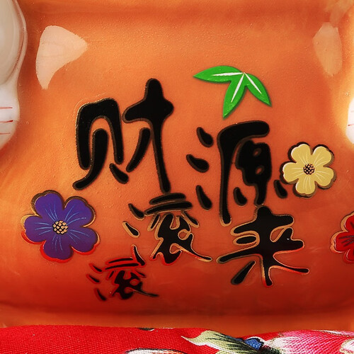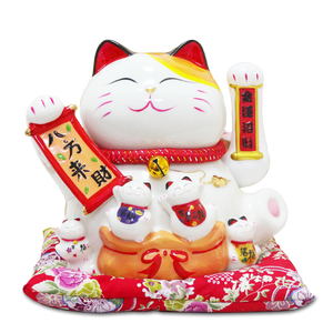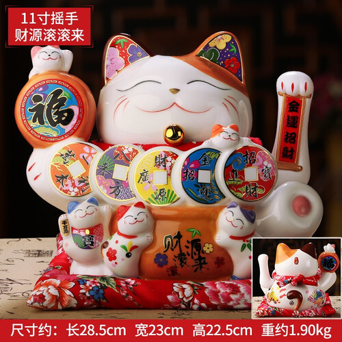 以陶瓷材质制成的招财猫,加持精细的上色工艺,层次分明外形更显精美。怀抱五个彩色的圆形钱币,象征着招福进宝财源滚滚来。