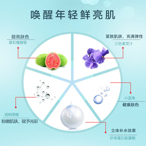 搭配透明质酸+氨基酸,带来立体补水效果,告别沙漠肌。添加番石榴提取物,get白里透红的美颜,让你颜值up。