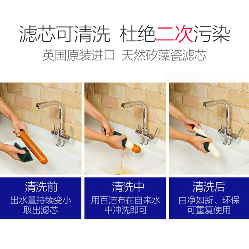 滤芯可以拆卸水洗,避免污垢堆积影响出水量,重复使用,节省家庭开支。无需插电且无废水,安全无隐患。