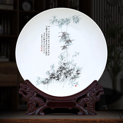 一款名为“咏竹”的装饰摆件,采用古法制瓷工艺,圆盘设计符合中式审美风格,竹配文结合,散发浓郁的古典文化气息。