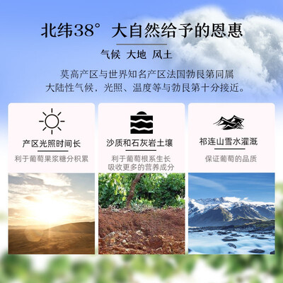 种植区具有得天独厚的种植环境,水资源丰富,土壤肥沃,适合葡萄生长。经过长时间的陈酿,让酒体更加醇厚丰富。