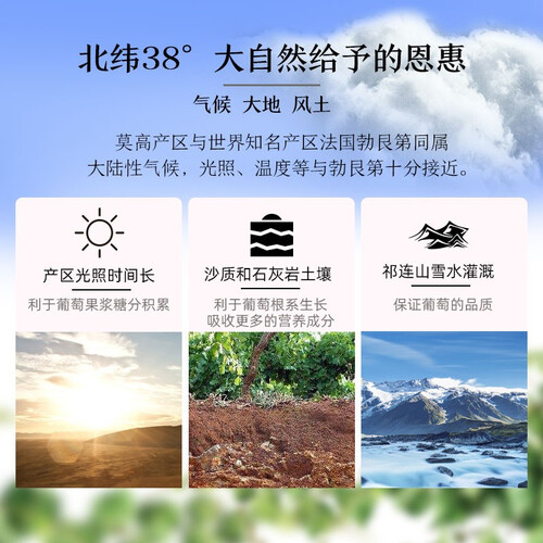 生产基地具有优越的生态环境,土壤肥沃,降雨量少,非常适合葡萄生长。此酒适合冷藏,冷藏之后口感甘冽爽口。