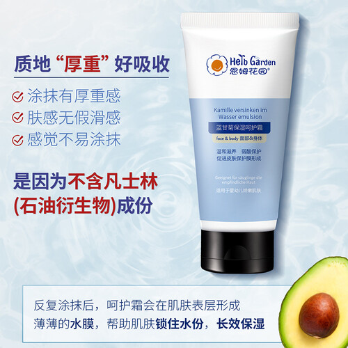 特含蓝甘菊油及牛油果树果脂等天然植物精粹,温和保湿,长时间滋润,促进皮肤保护膜形成,使肌肤达到健康娇嫩状态。