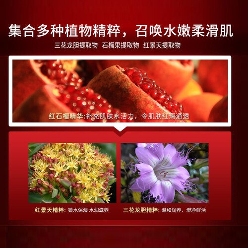 蕴含红石榴萃取成分,补充肌肤水活力,令肌肤红润通透,红景天萃取成分,锁水保湿。