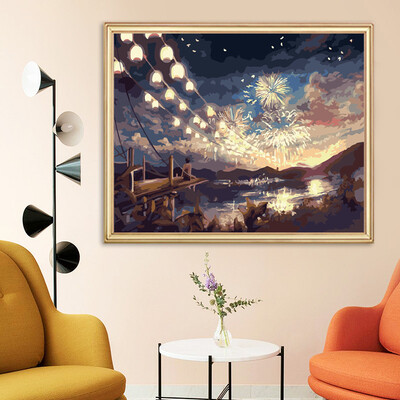 选用烟火的景象,运用了雅致的色彩,凸显出傍晚时分烟花美轮美奂的画面;油画尺寸较大,丰富了单调的墙面,优化了家庭环境。