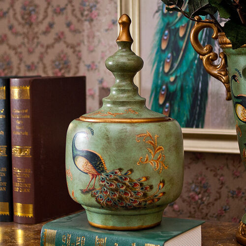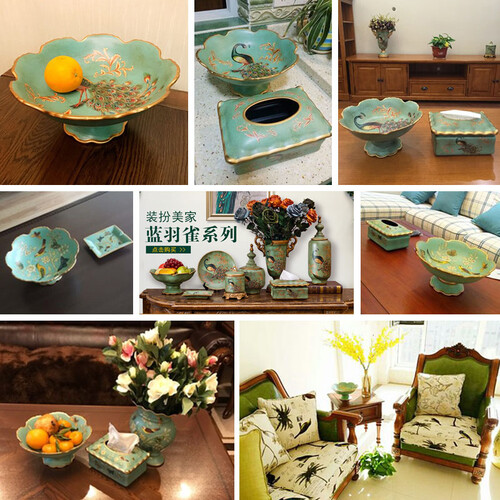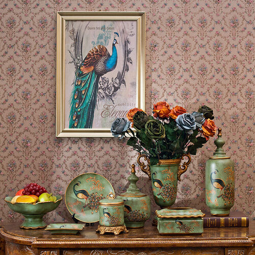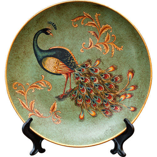 彩绘孔雀栩栩如生,色泽深浅渐变,鲜艳明亮,充满了大气感,盘边波浪流畅细腻,釉面做旧更显古朴,充满了欧式古典气质。