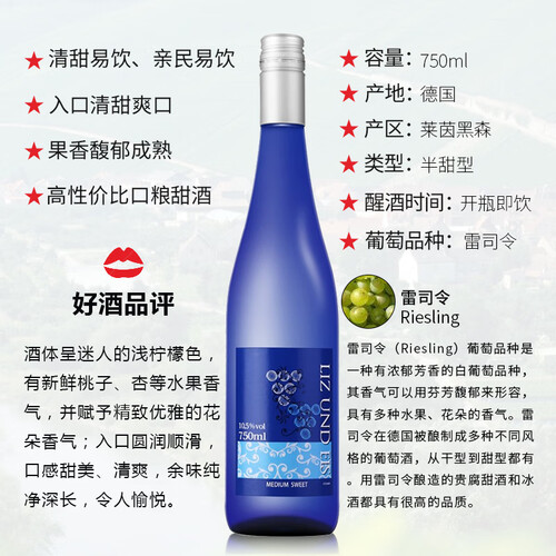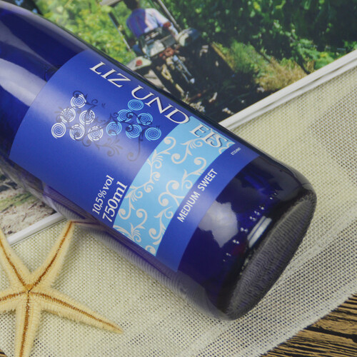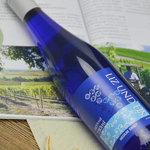 酒液呈透明色,散发浓郁的西柚、菠萝等水果香气,单宁酸度平衡,酒感清新爽口,适合女性饮用。蓝色瓶身深邃优雅,彰显高端品质。