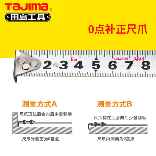 采用ABS树脂外壳,SK85双色双面钢尺带,两面均可测量;锁定按钮,手感光滑舒适;0点补正尺爪,可修正测量值。