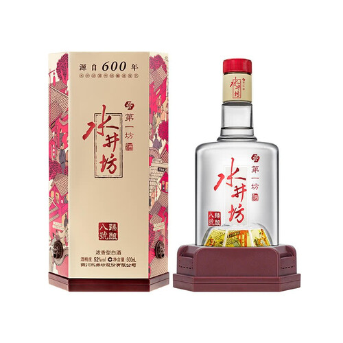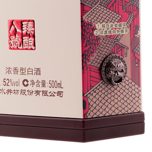 瓶底烧画设计,呈现古代水井街的繁华景象,展现我国古代风情瓶身的设计,古典雅致。精选五谷发酵的自然酿造,酒感浓香口感柔和。
