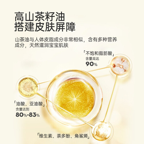 萃取珍贵的山茶油精华成分,能让肌肤远离干燥,并能预防干裂。特别添加茶多酚等多种活性成分,滋润宝宝肌肤。