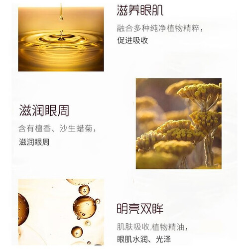 添加黄金洋甘菊提取物,淡化黑眼圈,双眸更加有神采。选用北美金缕梅+霍霍巴油,镇定舒缓眼周肌肤,有助于平衡水油。