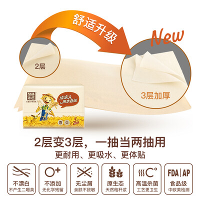 层层严格工艺净化制作,拒绝有污染物质残留,皮肤敏感人群也可使用。采用小麦秸秆原生浆,每一张纸巾都有小麦自然的味道。