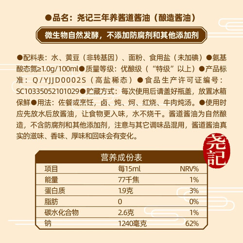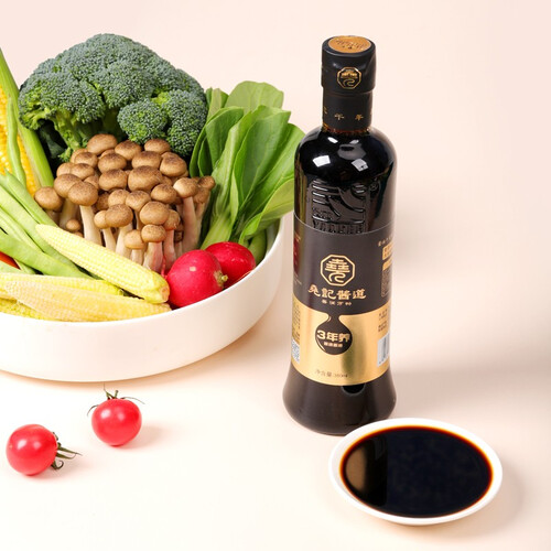 酱油经过1095天的日晒夜露,色泽浓郁,口感醇厚。选用四种优质原料,严选非转基因黄豆酿造,品质天然。