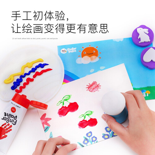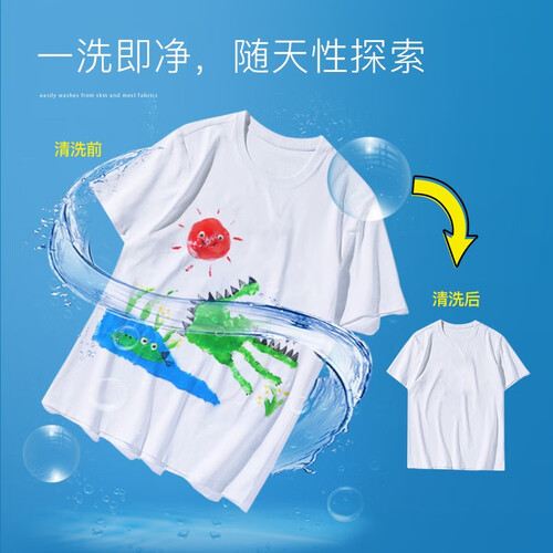 提供家庭指导手册,让颜料搭配不同工具使用,提高趣味性;采用一洗即净的配方,还可在白色体恤上作画,充分释放宝宝想象力。