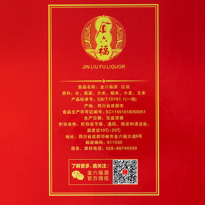 精美的红色外包礼盒,寓意富贵吉祥,鸿运当头,给人送礼更有面子。绵长尾净的口感,入喉劲爽,续杯更欢畅。