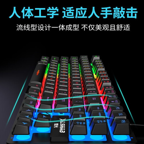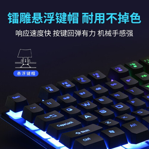 采用悬浮键帽设计,敲击手感佳,响应速度快回弹强,营造舒适机械手感。采用人体工学设计,科学布局方便操作,久用不易累。