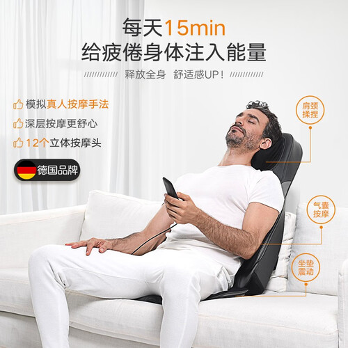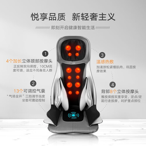 内置13个可调控气囊,不挑体型,胖瘦都能用。颈部部分内置4个揉捏按摩头,可通过遥控器调控旋转方向。