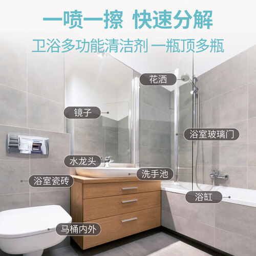 快速分渗透分解技术,可生成瓦解,顽固的水垢、皂垢、以及黄斑等各种浴室常见的污垢,进口椰油萃取精华,除垢高效不费力。