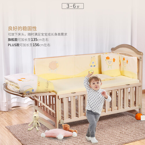 多功能拼接大床设计,床板加长设计,适合家庭使用,带滚轮方便移动,不占地方,两层带围栏,空间大,不怕宝宝睡着跌落。