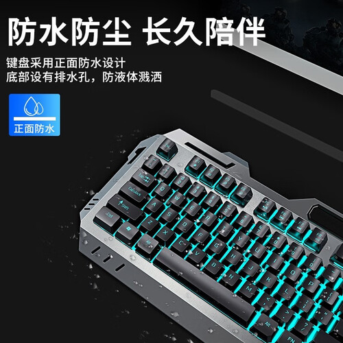键盘采用正面防水设计,底部设有排水孔,防液体溅洒,在键盘底部加了活动脚架,稳固键盘,不轻易晃动。