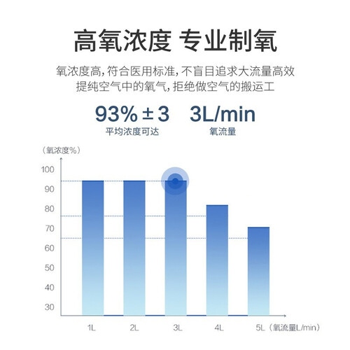 采用优质进口分子筛,实现高浓度制氧,带来更舒适的吸氧体验。标准旋转式流量计设计,直观性更强,流量控制更方便。