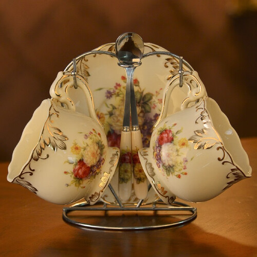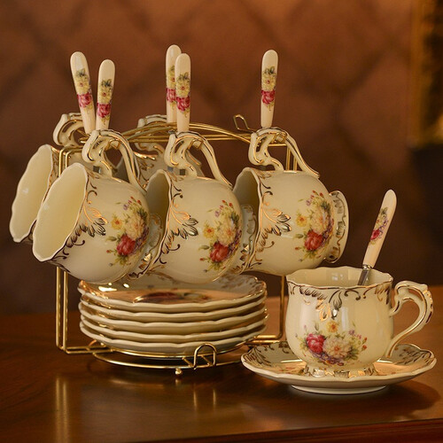 友来福咖啡杯套装采用优质密实陶土制成,不含汞铅,使用健康。手绘描金,勾勒图案轮廓,让其看起来色泽更加明亮。