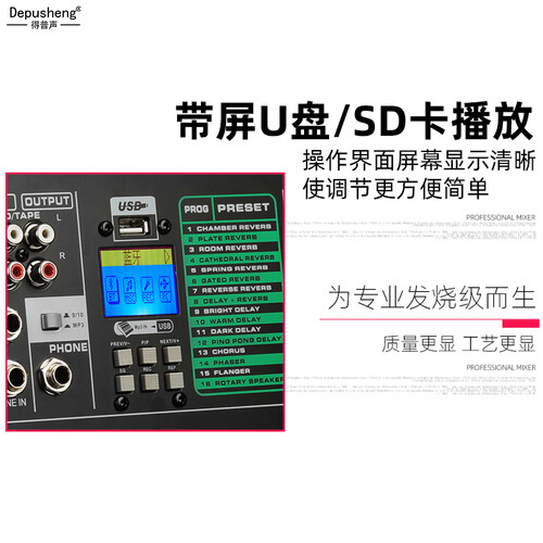 内置DSP混响效果,随心调节至理想效果,轻松玩转各种音乐场合,搭配双7段音乐均衡,细腻调节每个音节,带来出众听感。