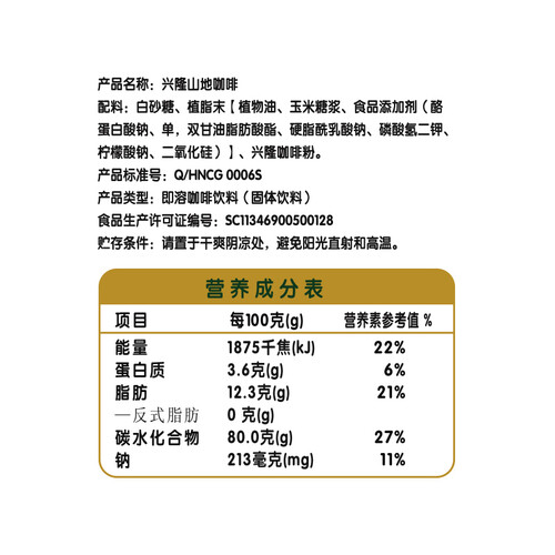 采用高山种植优质咖啡豆,运用炭火烘焙工艺,具有多层次的均衡口感。颗粒研磨细腻,溶解性好,具有醇厚碳烟熏香口感。