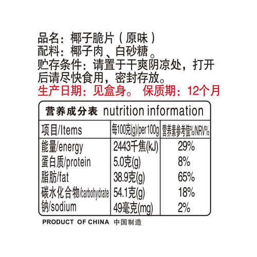 传统配方现代工艺打造,美味休闲椰子脆片。优质椰肉,甜润爽口,椰香四溢。选用新鲜椰子加工研制,走哪吃哪。