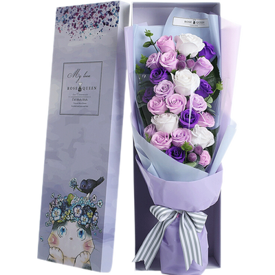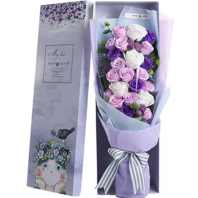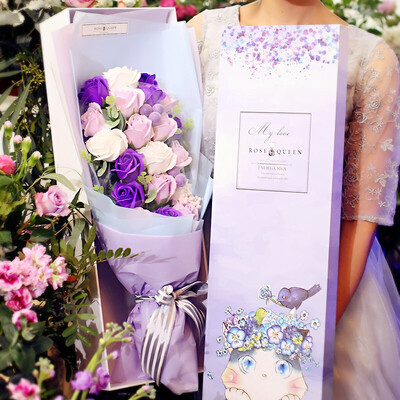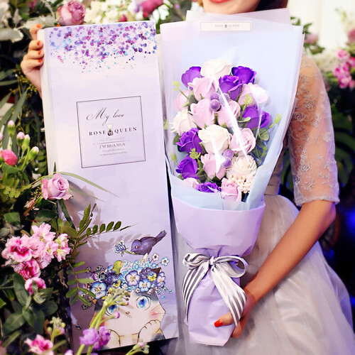 以典雅的紫色玫瑰为主体,搭配优雅清新浅色花朵点缀,美观大方,提升花束观赏性,结合甜美的紫蓝色包装,更添清新感。