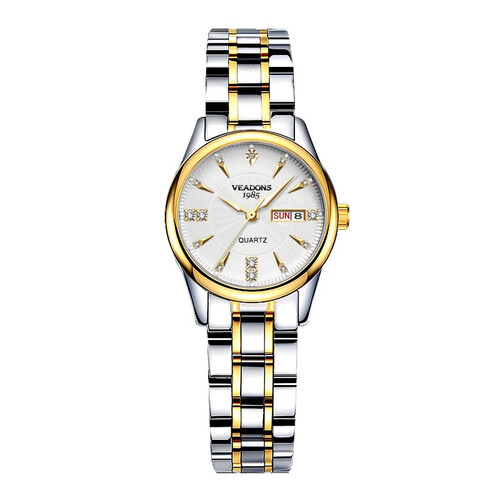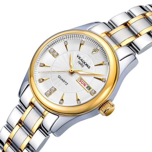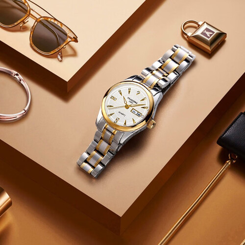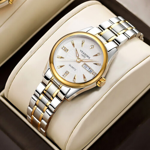 蝴蝶表扣显得美观,操作简单,方便佩戴。金色表壳轻奢大气,可以衬托出白皙的肌肤。严密底盖,满足防水需求。