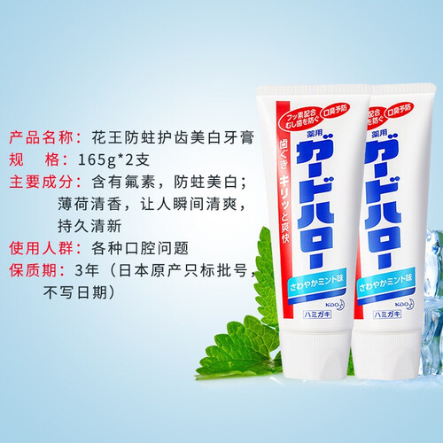 内含氟元素,守护牙齿和牙龈健康,预防蛀牙。拥有清爽的薄荷香味,去除口气,说话间口气清新怡人,拉近彼此间的距离。