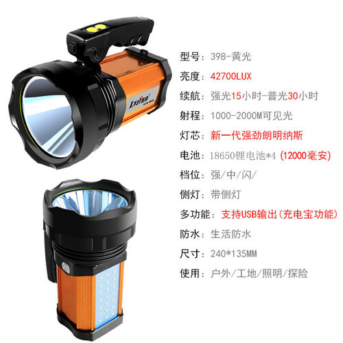 手电的尾部加入USB输出口,可用于充电宝使用,提高其实用性。采用四核灯芯,功率大,形成明亮的光源,照射出耀眼的光芒。