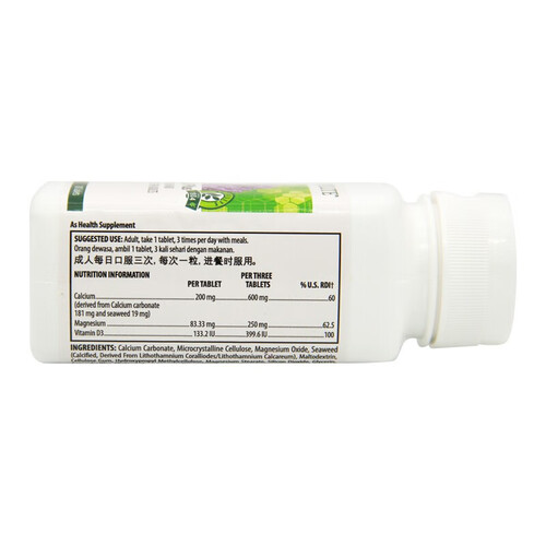 每份200mg钙和83.33IU镁,科学配比,均衡补充人体所需。特别添加维生素D3,能促进钙吸收。